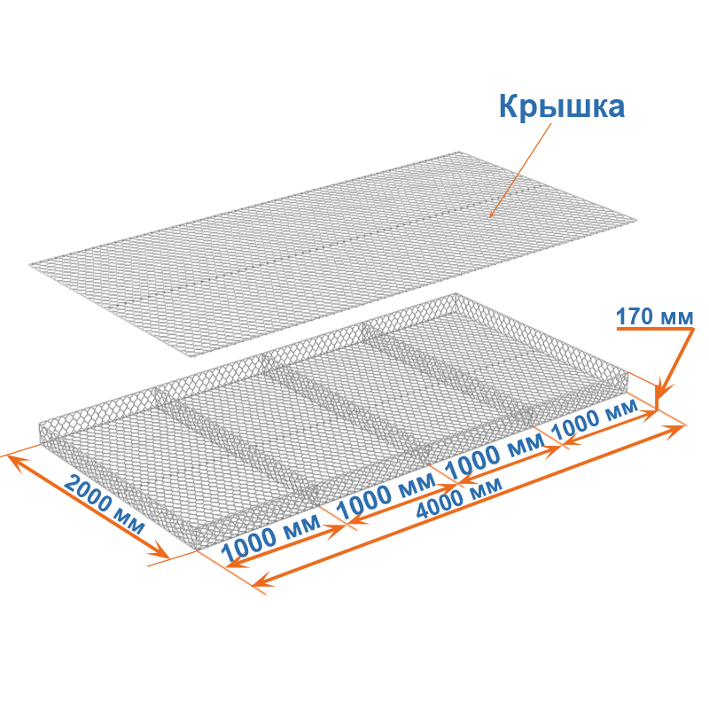 Матрасы Рено 4x2x0,17 — плоские габионные секции из сетки двойного кручения с ячейкой 80х100, проволокой 2,7 мм и покрытием Цинк.